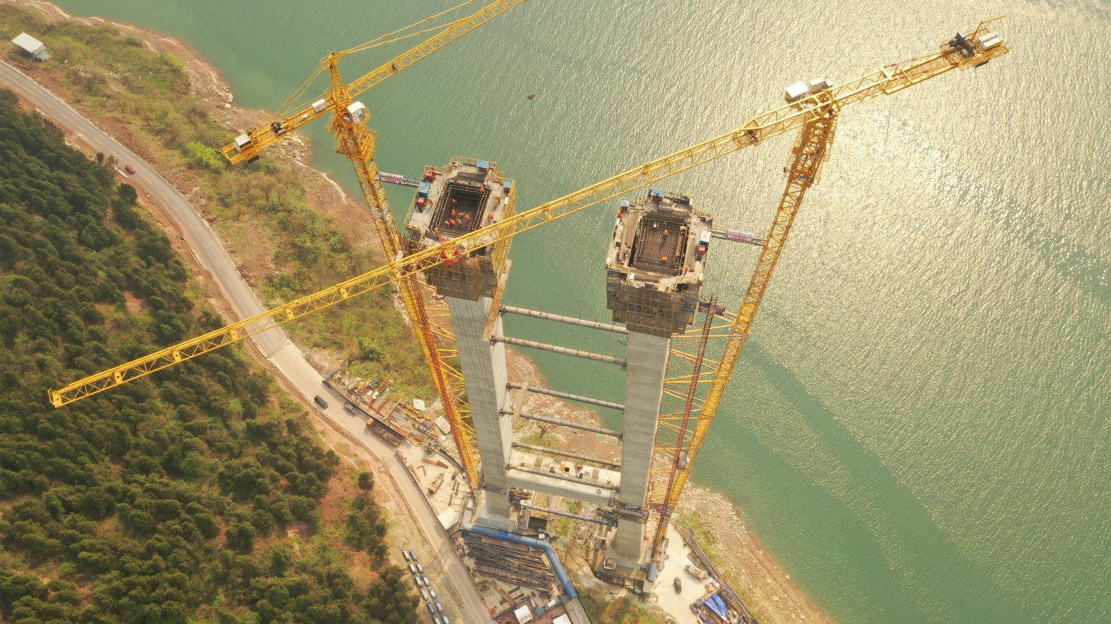 新田長(zhǎng)江大橋是萬州環(huán)線高速公路項(xiàng)目關(guān)鍵控制性工程,大橋全長(zhǎng)約1.7公里,主跨1020米,是三峽庫(kù)區(qū)在建跨度最大的雙塔單跨鋼箱梁懸索橋,大橋主塔采用門式框架結(jié)構(gòu),受地形限制,上、下游側(cè)索塔塔柱采用不等高設(shè)計(jì),其左幅索塔總高177.5米,右幅索塔總高161.5米。左幅主塔劃分為30個(gè)節(jié)段,采用液壓爬模施工,單節(jié)混凝土澆筑高度達(dá)6米,本主塔在全線率先施工,并按既定節(jié)點(diǎn)目標(biāo)高效完成主塔施工任務(wù)。目前,項(xiàng)目整體施工進(jìn)度正按預(yù)定計(jì)劃快速推進(jìn),右幅主塔預(yù)計(jì)3月底完成封頂。