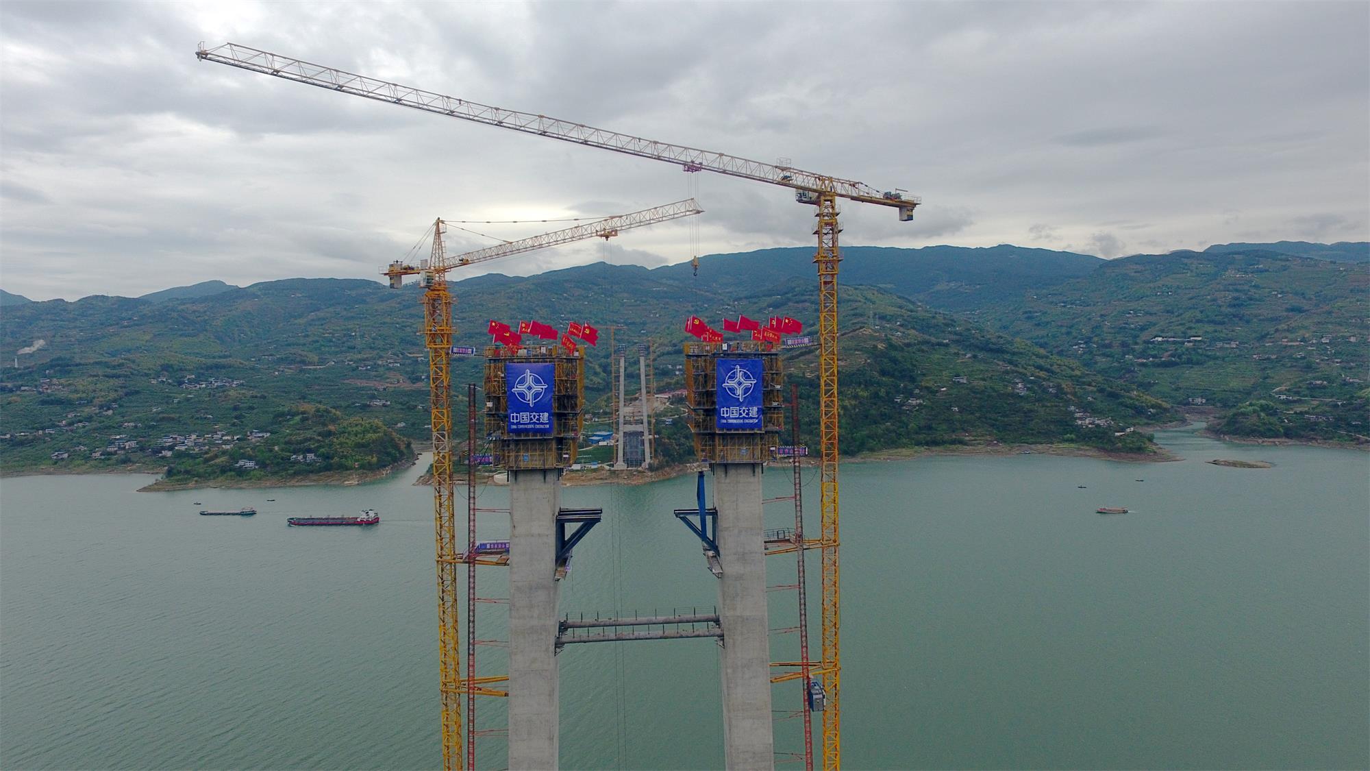 重慶萬(wàn)州新田長(zhǎng)江大橋是萬(wàn)州環(huán)線(xiàn)高速公路的控制性工程,主跨長(zhǎng)達(dá)1020米,是三峽庫(kù)區(qū)在建跨徑最大的橋梁。大橋主塔采用門(mén)式框架結(jié)構(gòu),結(jié)合既有山勢(shì)地形條件,采取不等高式高低塔,主塔左幅索塔高177.5米,右幅索塔高161.5米。施工組織充分考慮長(zhǎng)江經(jīng)濟(jì)帶環(huán)保要求高、臨江陡崖地帶地形條件復(fù)雜、特種設(shè)備高空作業(yè)安全風(fēng)險(xiǎn)大等特點(diǎn),通過(guò)BIM+技術(shù)集成深度應(yīng)用,成功對(duì)大橋結(jié)構(gòu)線(xiàn)型和索塔樁基等進(jìn)行優(yōu)化,開(kāi)創(chuàng)性使用全封閉式智能液壓爬模和高空無(wú)落地式支架體系。通過(guò)脫模劑比對(duì)試驗(yàn)和配合比優(yōu)化管理,實(shí)現(xiàn)主塔混凝土拆模后達(dá)到“鏡面”效果,為類(lèi)似主塔施工提供可靠大數(shù)據(jù)和可借鑒的寶貴經(jīng)驗(yàn)支持。
