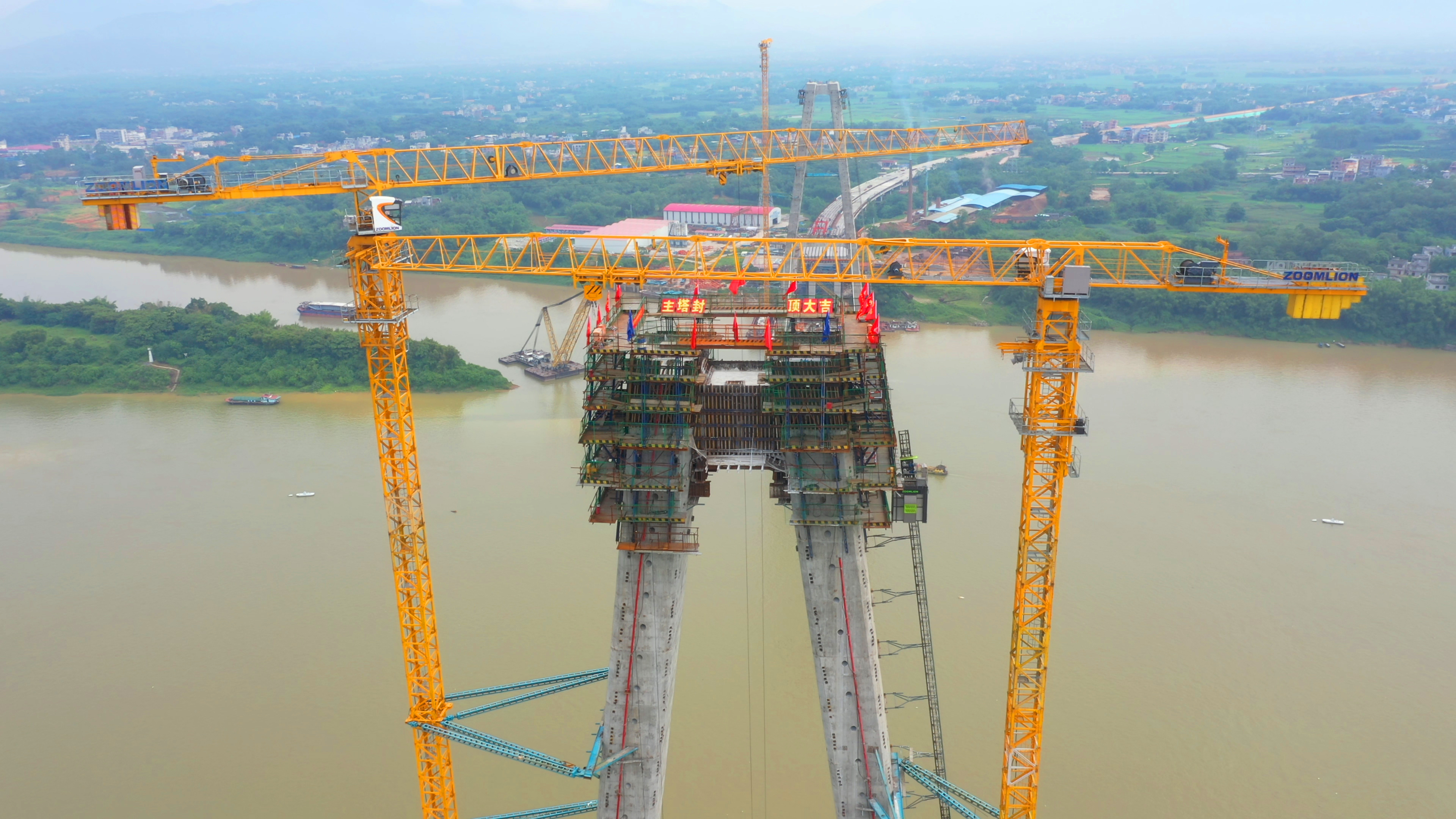 5月28日,廣西最大跨徑斜拉橋——荔浦至玉林高速公路平南相思洲特大橋實現(xiàn)雙主塔封頂。該橋兩座鉆石型塔柱高達147.3米,為廣西最高橋塔。塔柱聳立于潯江兩岸,呈比翼齊飛之勢,大氣磅礴。